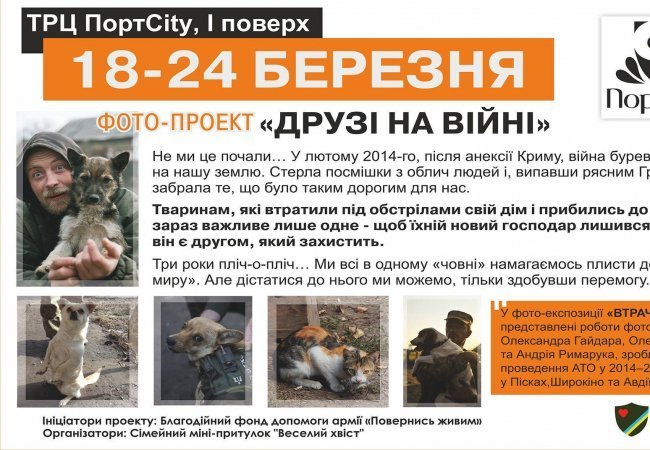 “Гортаючи архіви з чергових поїздок в АТО – ми побачили, що є чимало світлин з собаками і котами, що прижились на позиціях у військових, кошенята, що народилися під обстрілами, і т.д. Вирішили , що це варто показати, тим паче, що у кожного фото є своя історія” - так говорять ініціатори проекту з Благодійного фонду допомоги армії "Повернись живим".