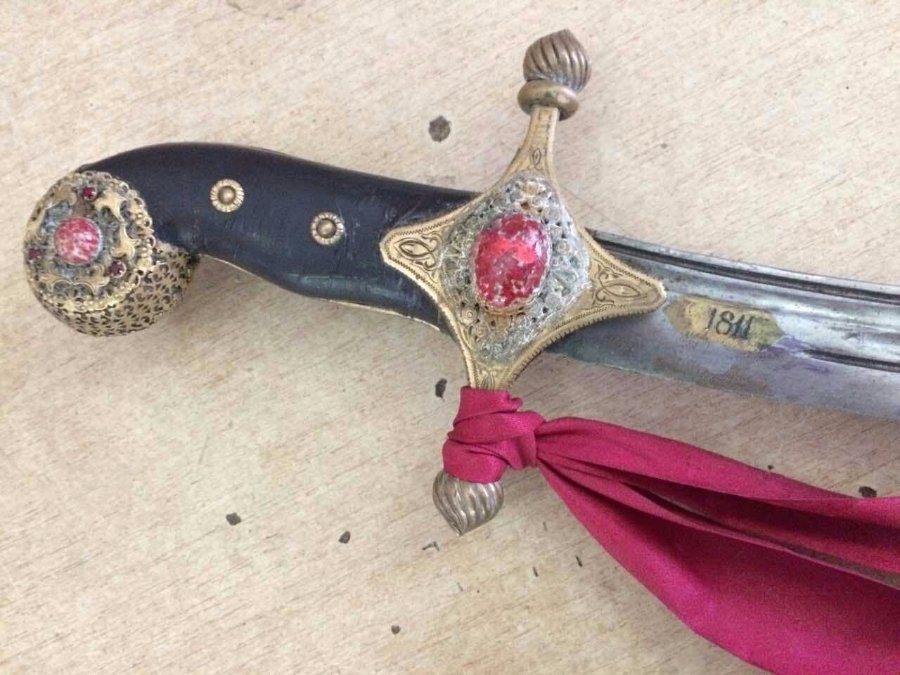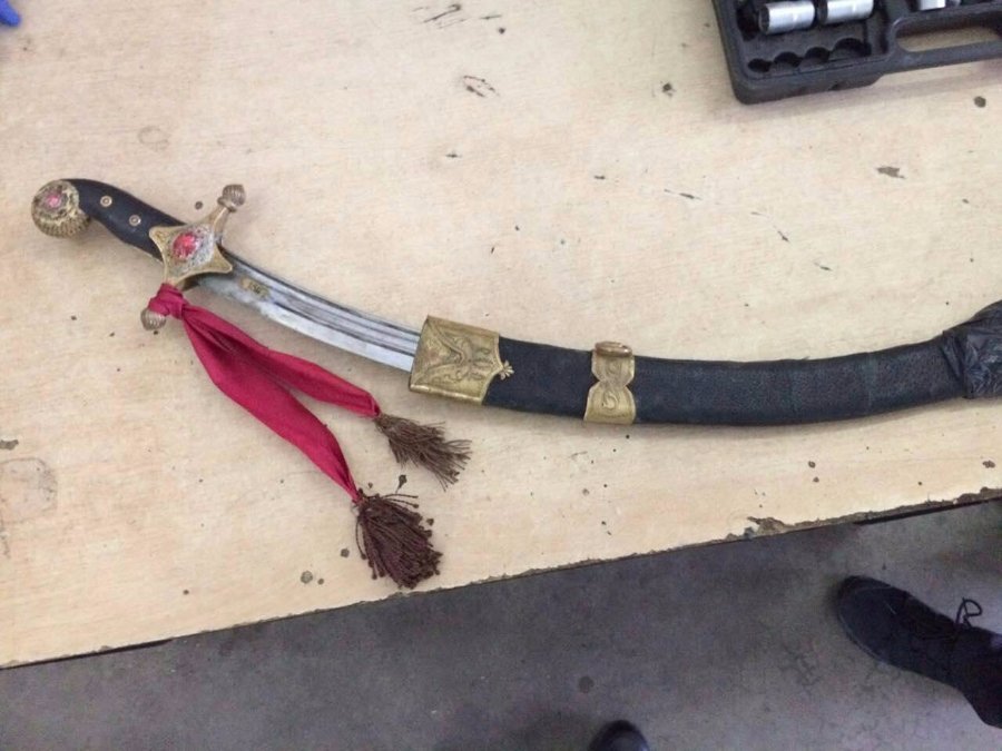 Зокрема чоловік віз шаблю з рукояткою чорного кольору, оздоблену металом жовтого кольору та камінням червоного кольору невстановленого походження та піхви чорного кольору, оздоблену металом жовтого кольору, які були загорнуті в поліетиленову плівку.