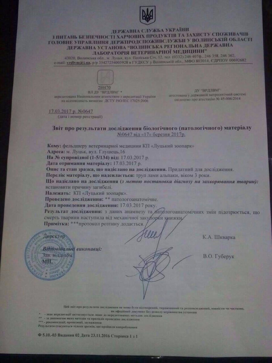 «Маючи на руках офіційні документи, повідомляємо вам про смерть нашої підопічної – самички альпаки. На жаль, як свідчать результати розтину, врятувати її було нереально, бо надію на одужання могло б дати лише хірургічне втручання, яке у нас не є можливим», – зазначають у дописі.