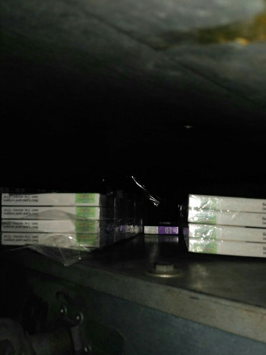 В міжстелевому просторі купе відшукали ще 1280 пачок сигарет. Із них 850 пачок «LD super slims» з акцизними марками України, а також 430 пачок сигарет «Compliment super slims», на яких були відсутні акцизні марки України.