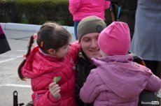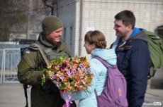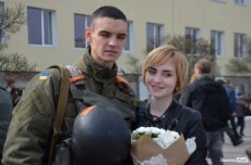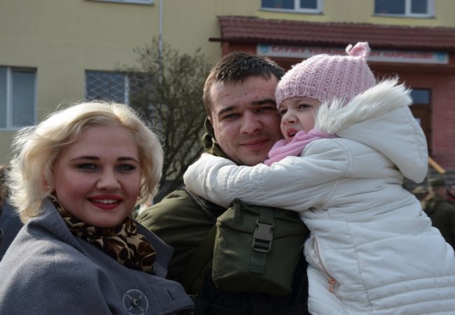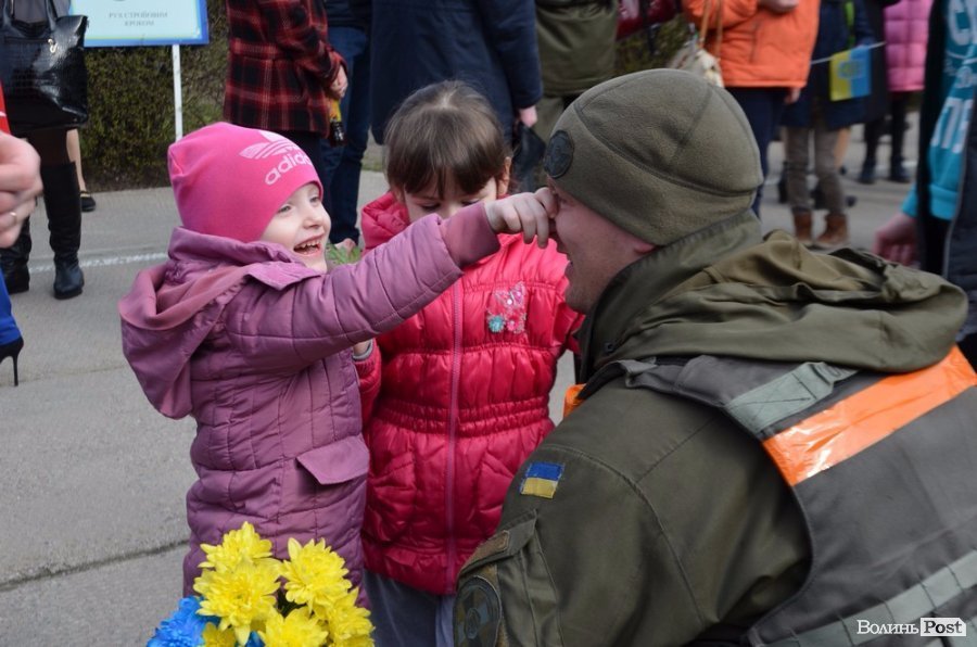 Ще до повернення нацгвардійців на плацу зібралися десятки людей, які понад 2,5 місяці чекали на нагоду зустрітися із близькими, друзями чи знайомими. Чи не найнетерплячішіми були діти із квітами та синьо-жовтими прапорцями, які вчергове перепитували, коли вже приїде тато. До слова, разом із чоловіками на Сході відбувала службу й одна жінка-військовослужбовець.