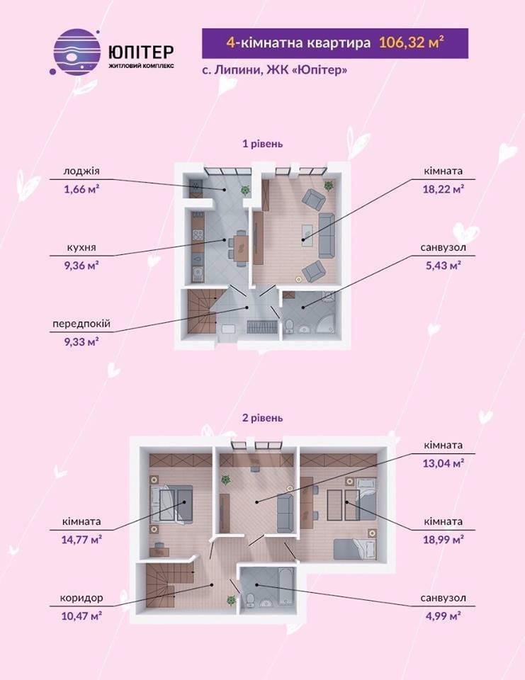 4-кімнатна дворівнева квартира загальною площею 106,32 кв.м у житловому комплексі «Юпітер» – 1 120 000 гривень.