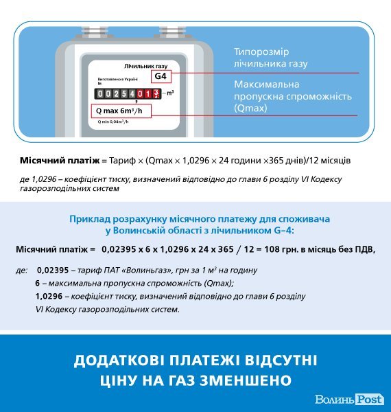 Приклад розрахунку місячного платежу для споживача у Волинській області з лічильником G-4 (відповідно до формули, затвердженої НКРЕКП):