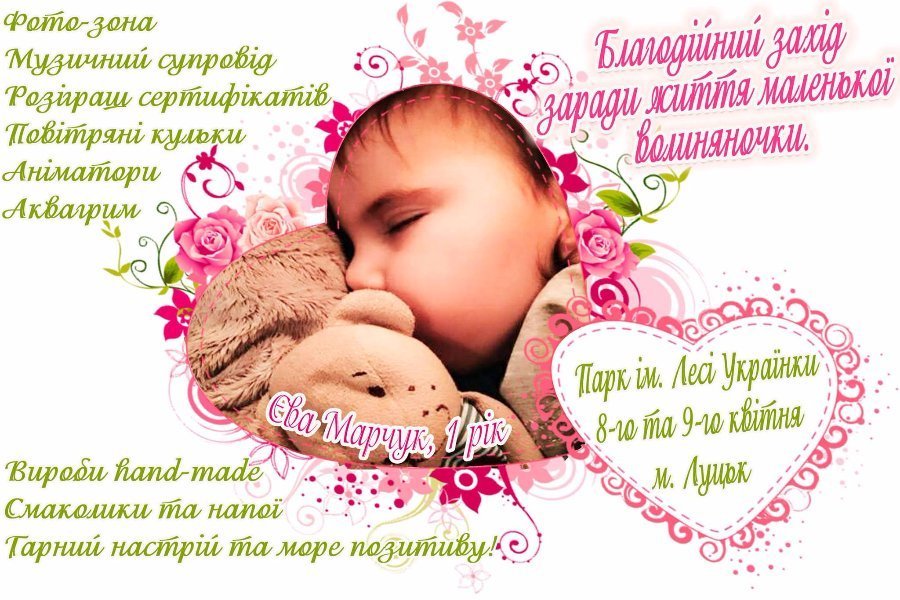 Тож, мами Луцька вирішили організувати благодійний захід, аби допомогти зібрати гроші. На гостей чекають професійні фотографи та фотозона, музичний супровід протягом усього дійства, розіграш цінних сертифікатів, повітряні кульки, аніматори, аквагрим, ярмарок hand-made, смаколики та напої, гарний настрій та море позитиву.