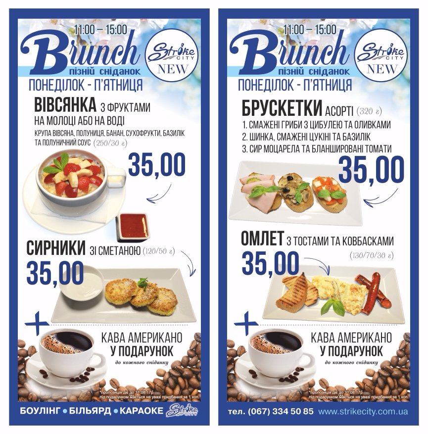 Кулінари «Strike City» підготували смачну новинку для любителів пізнього сніданку. Відтепер у будні із 11.00 до 15.00 усього за 35 гривень можна скуштувати бранчі на вибір: вівсянка, брускетки асорті, омлет чи сирники.