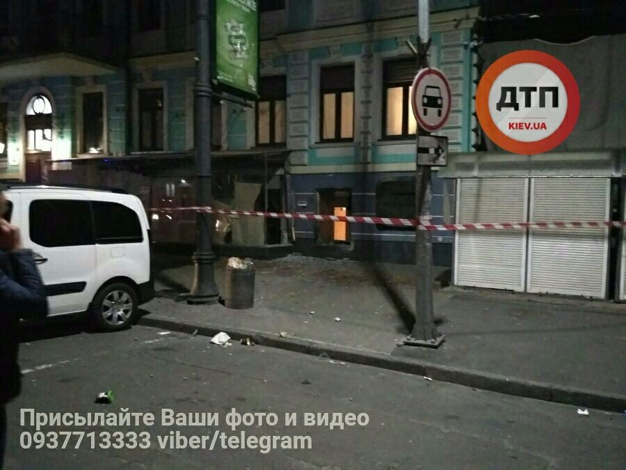 Вибуховою хвилею винесло шибки не тільки на першому поверсі будинку, де розміщуються ресторан та банк, без скла залишилися і припарковані автомобілі. Renault, що стояв біля входу, винесло заднє скло і пом'яло дах, передає dtp.kiev.ua.