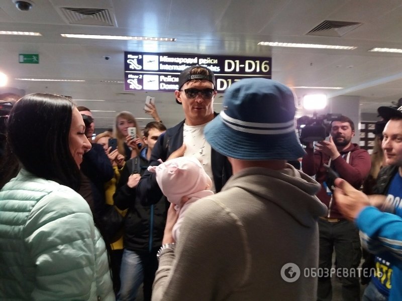 Відповівши на запитання преси, Олександр потрапив в обійми свого друга Дениса Берінчика, який приїхав зустрічати чемпіона з дружиною і маленькою дитиною.