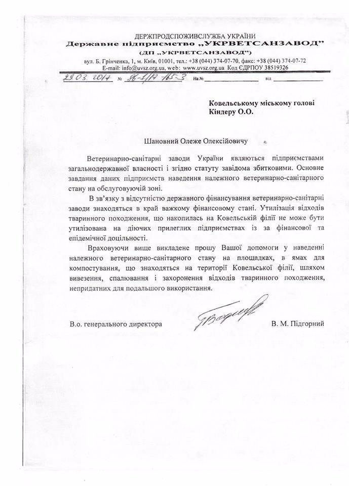 "В зв'язку з відсутністю державного фінансування ветеринарно-санітарні заводи знаходяться в край важкому фінансовому стилі. Утилізація відходів тваринного походження, що накопилась на Ковельській філії не може бути утилізована на діючих прилеглих підприємствах із за фінансової та епідемічної доцільності", - йдеться в листі.