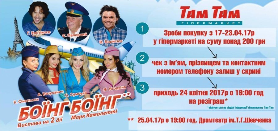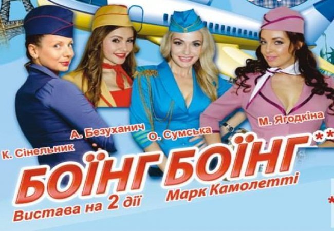 Боїнг-Боїнг» - легенда французького театру минулого століття. П'єса увійшла в книгу рекордів Гіннеса, поставлена в 60 країнах світу. «Боїнг - Боїнг» - комедія про роман молодого паризького ловеласа з трьома чарівними стюардесами.