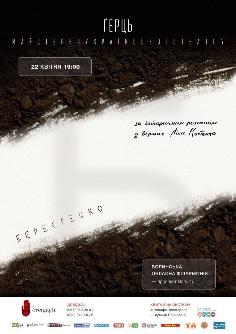 Нове прочитання відомого роману у віршах поетеси Ліни Костенко «Берестечко» презентує в Луцьку майстерня українського театру ҐЕРЦЬ. Вистава відбудеться 22 квітня о 19:00 у Волинській обласній філармонії.