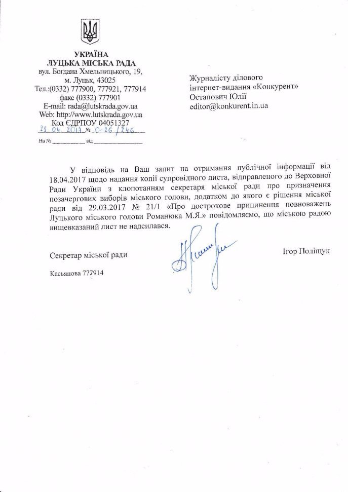 В.о. міського голови Ігор Поліщук досі не відправив у Верховну Раду рішення про взяття до відома факту смерті Миколи Романюка. Рішення Луцькради про припинення повноважень міського голови Миколи Романюка станом на 21 квітня досі не відправили.
