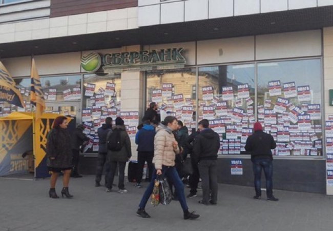 У Львові активісти партії Національний корпус заблокували відділення Сбербанку.