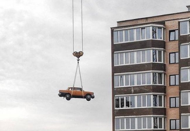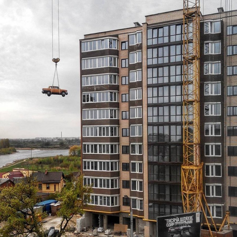 Лучанин Олександр Стеренчук зафіксував на фото, як на новобудову на вулиці Ковельській в обласному центрі Волині піднімають легковий автомобіль.