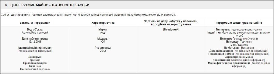 До слова, в декларації зазначено, що Інна Кошова отримала право користування транспортним засобом у той же день, коли його було зареєстровано на офіційну власницю Людмилу Торчинюк – 19 грудня 2015 року.