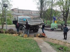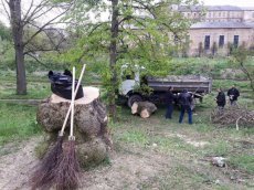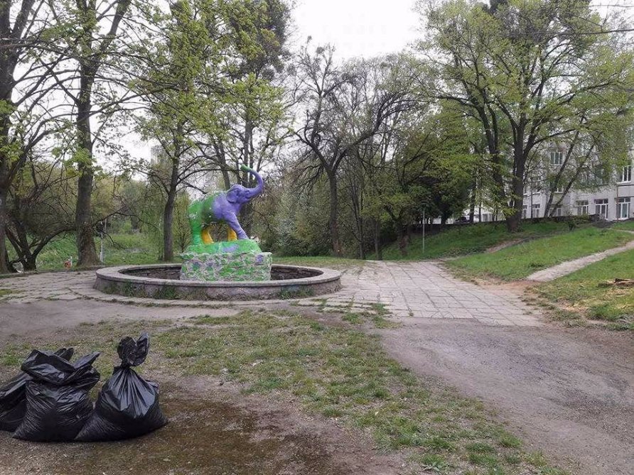 «Сьогодні дівчата «махали віниками») біля слоника , а хлопці зі Спілки учасників АТО навантажували, раніше зрізані (01.04) сухі гілки...» – коментує вона світлини.