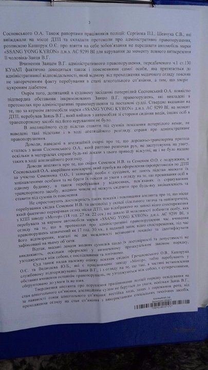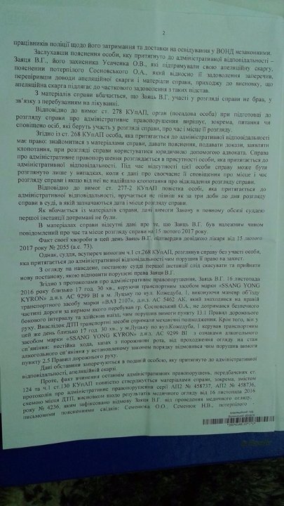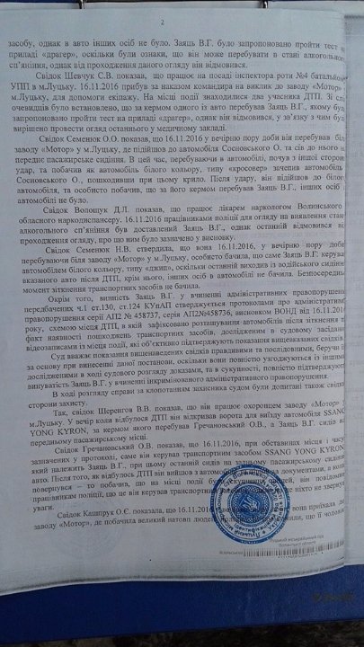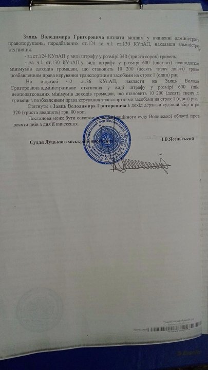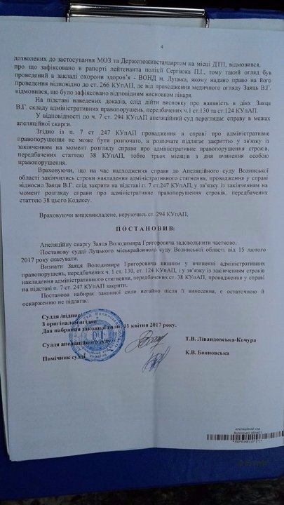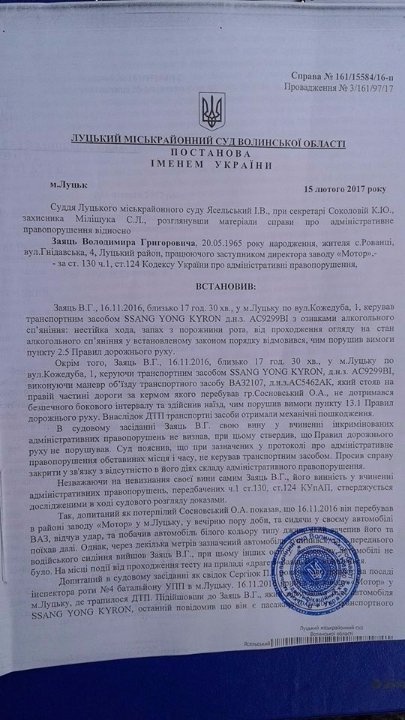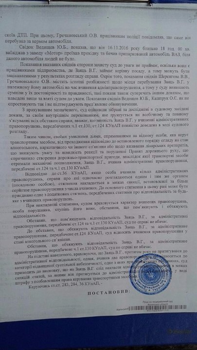 Таким чином, суд визнав Володимира Заяця винним у порушенні ч. і ст. 130 та ст. 124 Кодексу України про адміністративні правопорушення (керування транспортом в нетверезому стані та порушення правил дорожнього руху).