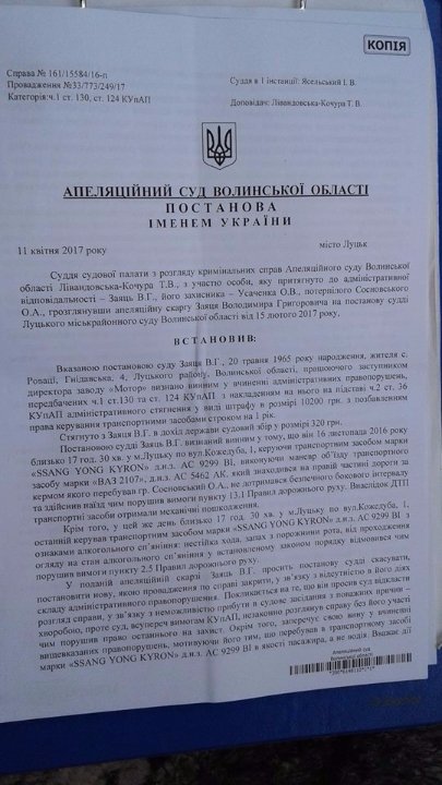 Апеляційний суд Волинської області підтвердив рішення попередньої судової інстанції про те, що замдиректора «Мотору» Володимир Заяць п'яним сів за руль та наїхав на інший автомобіль. Проте під час судової тяганини минув термін, передбачений законом для того, щоб притягнути порушника до відповідальності.