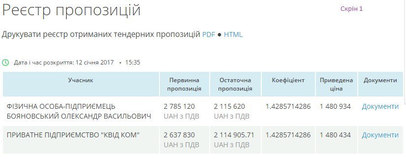 Таким чином, при заключені договору з одним із учасників торгів, економія бюджетних коштів становила б приблизно 1,2 млн. грн.!