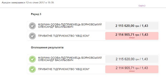 ФОП Бояновський О. В., початкова пропозиція -2 785 120,00грн.(104грн./кг), остаточна – 2 115 620,00 грн.(79 грн./кг);