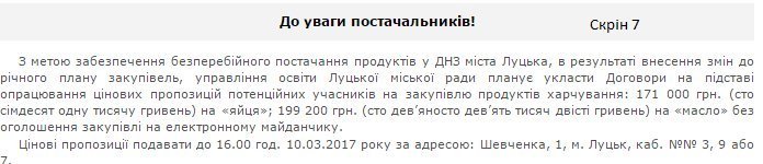 Так от, про потребу у закупівлі масла оголосило на своєму сайті управління освіти. Оголошення було оприлюднене без зазначення дати його публікації. Планувалось укласти договори на підставі опрацювання цінових пропозицій потенційних учасників без оголошення закупівлі на електронному майданчику. Кінцевий термін подання пропозицій визначили як 10.03.2017р. Для цієї закупівлі навіть внесли зміни у річний план закупівель 03.02.2017р.