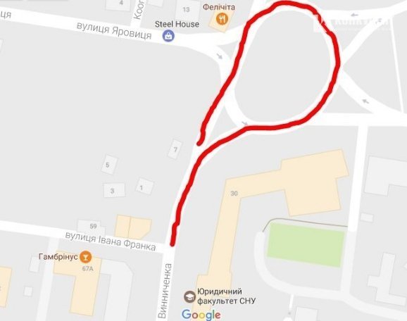 Та ж ситуація на повороті на вулицю Івана Франка. Водієві, який рухається вулицею Винниченка, необхідно об'їхати через кільце навпроти пам'ятника Грушевському і вулицею Стрілецька повернутися в напрямку вулиці Винниченка, щоб нарешті звернути на Франка.