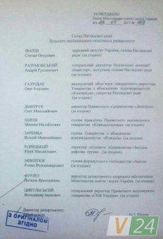 Згідно з документом, головою Наглядової ради вишу став народний депутат Степан Івахів, його заступником – гендиректор будівельної компанії «Інвестор» Андрій Разумовський, секретарем ради – в.о. гендиректора ТзОВ «Континіум» Олег Галущак.