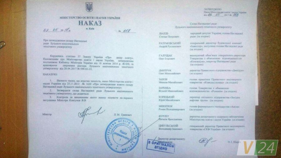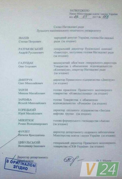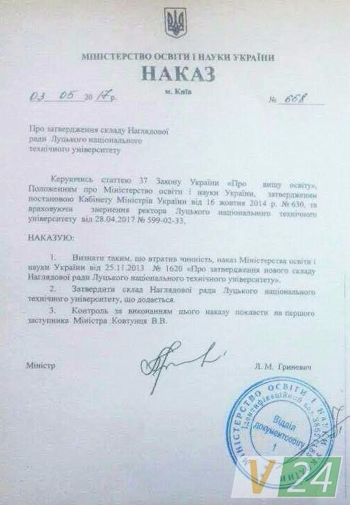 Наказ про зміну складу Наглядової ради міністр освіти та науки Лілія Гриневич підписала 3 травня 2017 року, інформує Волинь24.