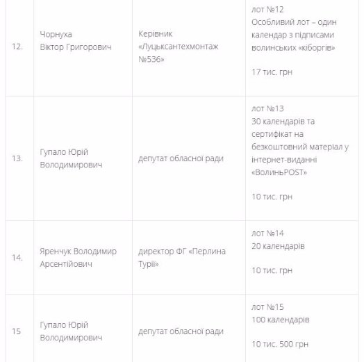 До слова, у «битві ставок» взяв участь і депутат Луцької міської ради Петро Нестерук, який викупив календарі та публікацію у газеті «Волинь-Нова» за 25 тисяч гривень.