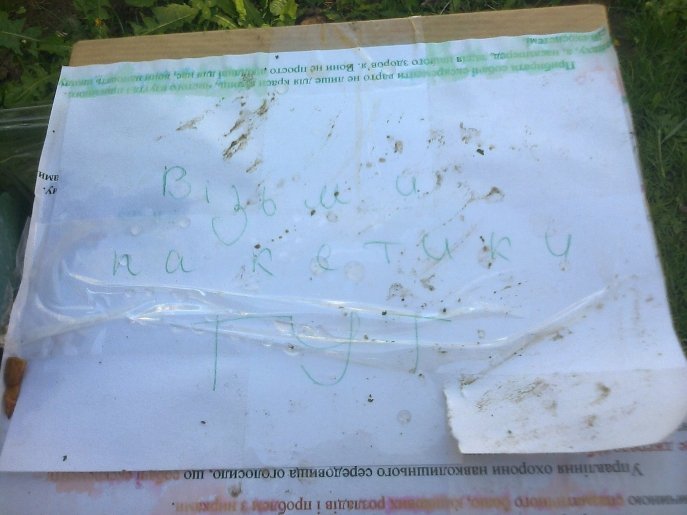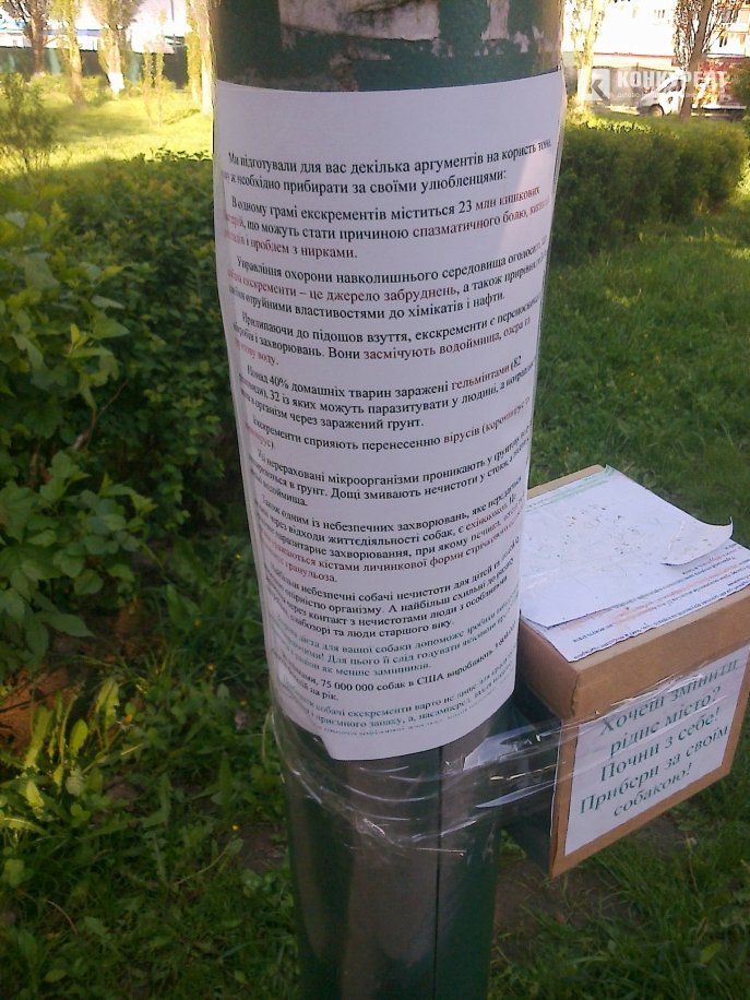 Біля оголошення на стовбі прилаштована коробка з поліетиленовими пакетиками для того, аби лучани могли прибрати випорожнення за собаками під час прогулянки.