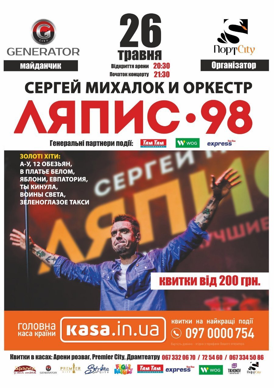 У «ПортCity» 26 травня відбудеться грандіозне музичне дійство. На арені «Generator City» виступить Сергій Михалок із гуртом «Ляпис 98». Шанувальники їхньої творчості матимуть змогу почути улюблені хіти «А-у», «Яблони», «Воины света» та інші композиції, які полюбилися мільйонам слухачів.