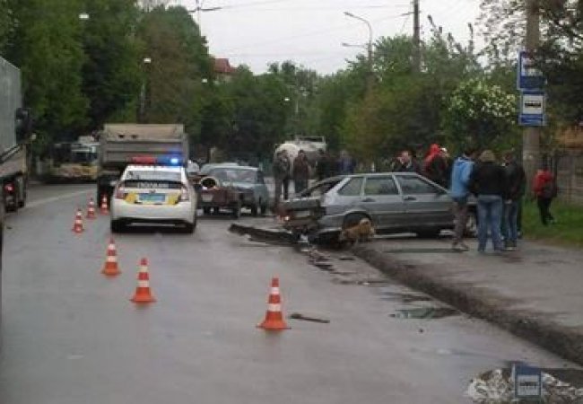 Останній автомобіль зазнав значних технічних ушкоджень та, виїхавши на тротуар, мало не протаранив огорожу будинку.