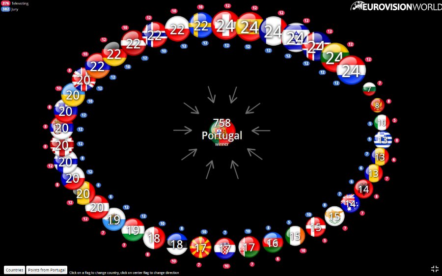 Країна-переможець Євробачення 2017 Португалія отримала найвищу кількість голосів. У багатьох країнах максимальні 12 балів Сальвадору Собралу дали як журі, так і глядачі. Зокрема, по 12 балів від журі та глядачів Португалії дісталося від Нідерландів, Литви, Ісландії, Ізраїлю, Франції, Іспанії та Швейцарії. Українське журі, так само як і українські телеглядачі, Португалії дали по 10 балів.