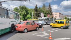 Як розповіли очевидці, автомобіль Chery їхав з боку вулиці Шевченка по проспекті Волі та пригальмував, повертаючи на вулицю Винниченка. З неї водночас виїжджав на Волі тролейбус №15а.