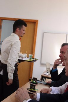 На початку глядачі спостерігали за тим, як бармен майстерно готує каву, а офіціанти витончено подавали її в додаток із цукерками.
