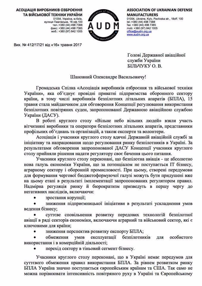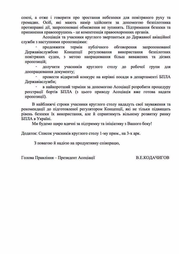Крім того, учасники круглого столу підготували звернення до Державіаслужби з проханням прийняти напрацьовані в ході обговорення пропозиції та зауваження до підготовленої регулятором Концепції регулювання використання безпілотних повітряних суден, а також включити учасників ринку безпілотних літальних апаратів в робочу групу Державіаслужби для подальшої роботи над документом.