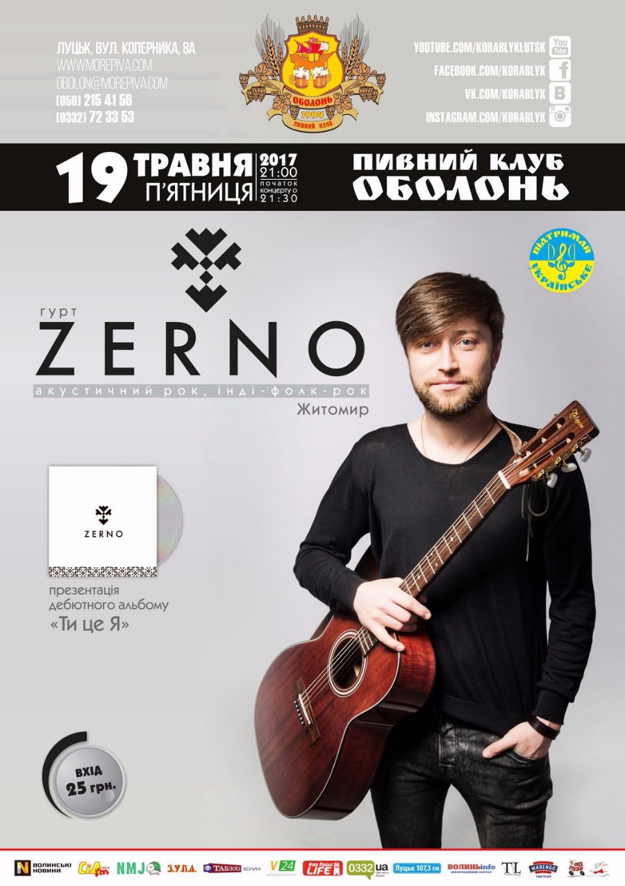 Більше року минуло з часу коли житомирська ватага "Zerno" вперше завітала до луцького Кораблика. Пам'ятаємо, що концерт видався на славу! І от трохи більше, ніж через рік після того візиту, хлопці везуть до Луцька свій дебютний альбом «Ти це Я", який планують презентувати країною впродовж найближчих місяців.