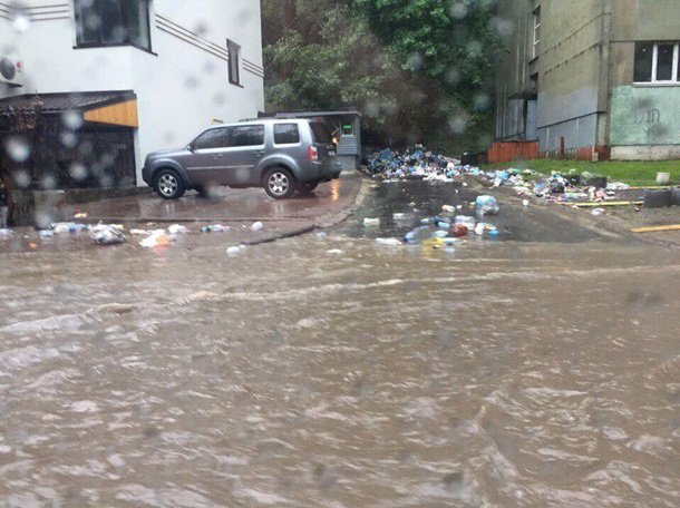 Жителі міста зазначають в групі Варта1 у Facebook, що після сильної зливи вулиці Львова, двори і під'їзди будинків затопило, а неприбране сміття рознесло потоками води.