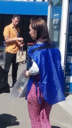 Аналогічно вдягнений чудак стоїть біля "Слона", так само збирає "на дитину"