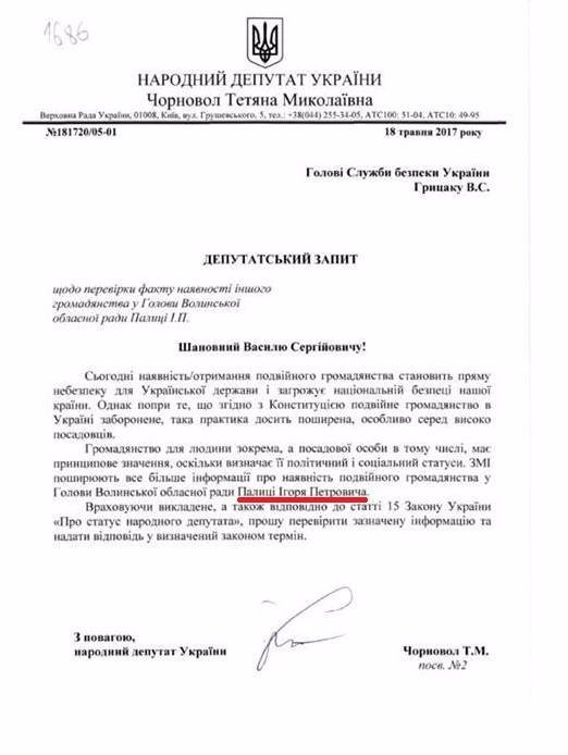 «Попри те, що згідно з Конституцією подвійне громадянство в Україні заборонене, така практика досить поширена, особливо серед високопосадовців. Громадянство для людини зокрема, а посадової особи в тому числі, має принципове значення, оскільки визначає її політичний та соціальний статуси. ЗМІ поширюють все більше інформації про наявність подвійного громадянства у голови Волинської обласної ради Палиці Ігоря Петровича», – заявила у депутатському запиті Тетяна Чорновол.