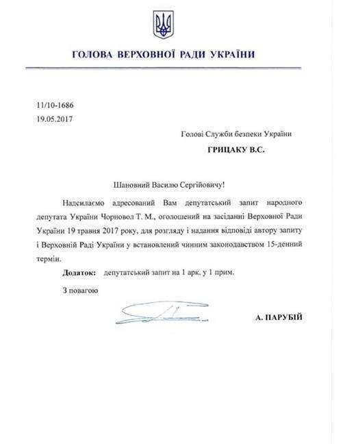 Тож вже 19 травня Голова Верховної Ради Андрій Парубій підписав та скерував відповідний запит нардепа Тетяни Чорновол до СБУ. Також, він просив надати відповідь автору запиту та Верховній Раді України встановлений законодавством термін — 15 днів.