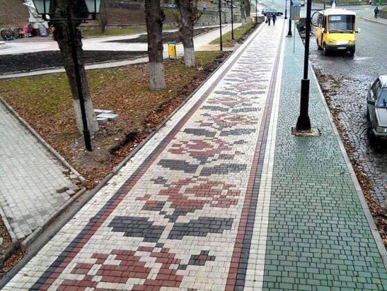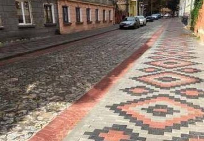 До переліку потрапила й луцька вулиця Крилова, тротуари якої в 2015 році працівники підприємства "Бетон Брук Сервіс" замостили бруківкою, створивши вишиваний узор.