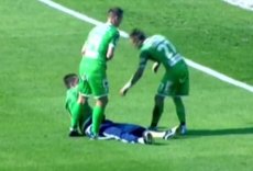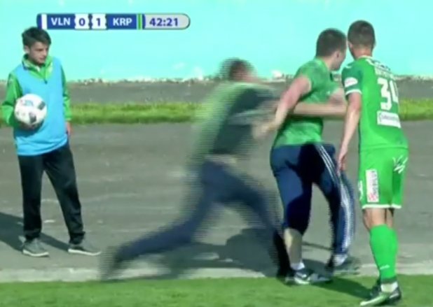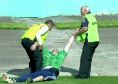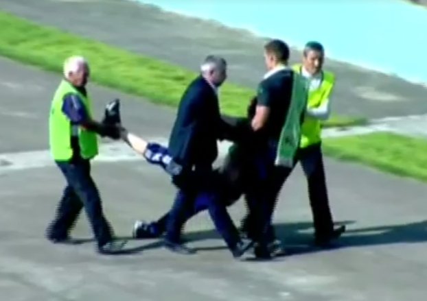 Хуліган сміявся, виривався з рук футболістів, але через сильне сп’яніння далеко на поле забігти не міг і кілька разів падав.