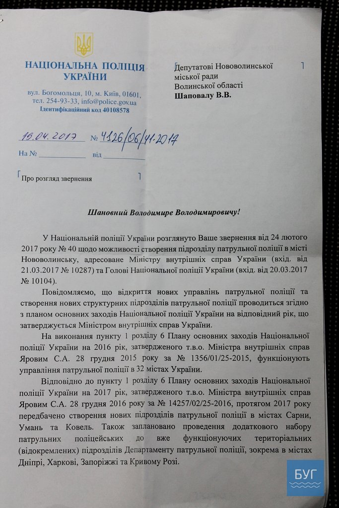 Депутат надіслав запит до МВС. Відповідь підписав заступник міністра. Він зазначив, що відкриття нових управлінь патрульної поліції та створення нових структурних підрозділів проводиться згідно з планом основних заходів Національної поліції України на відповідний рік.