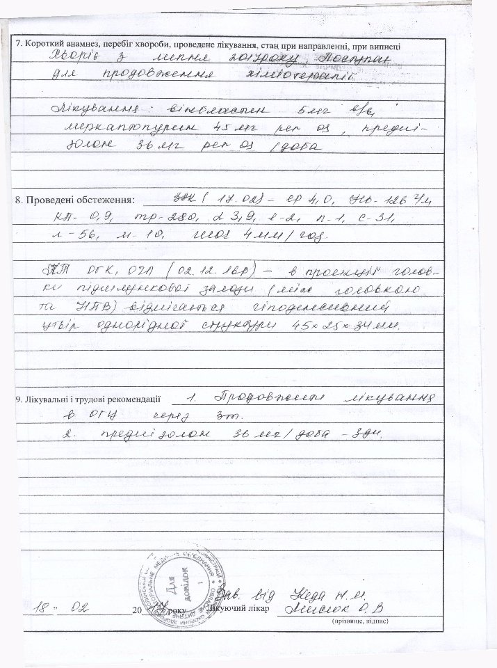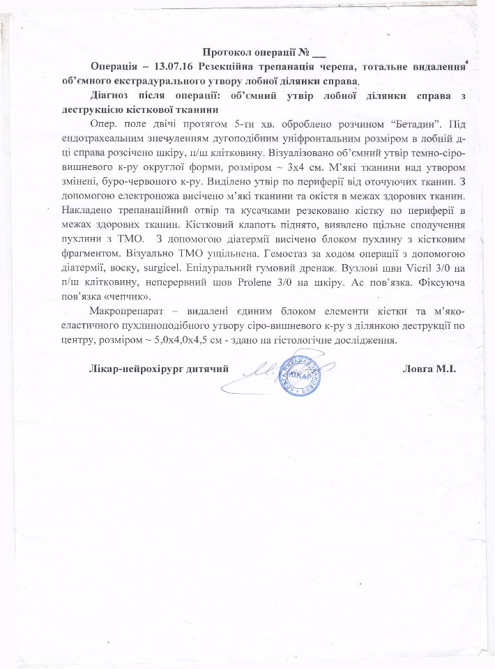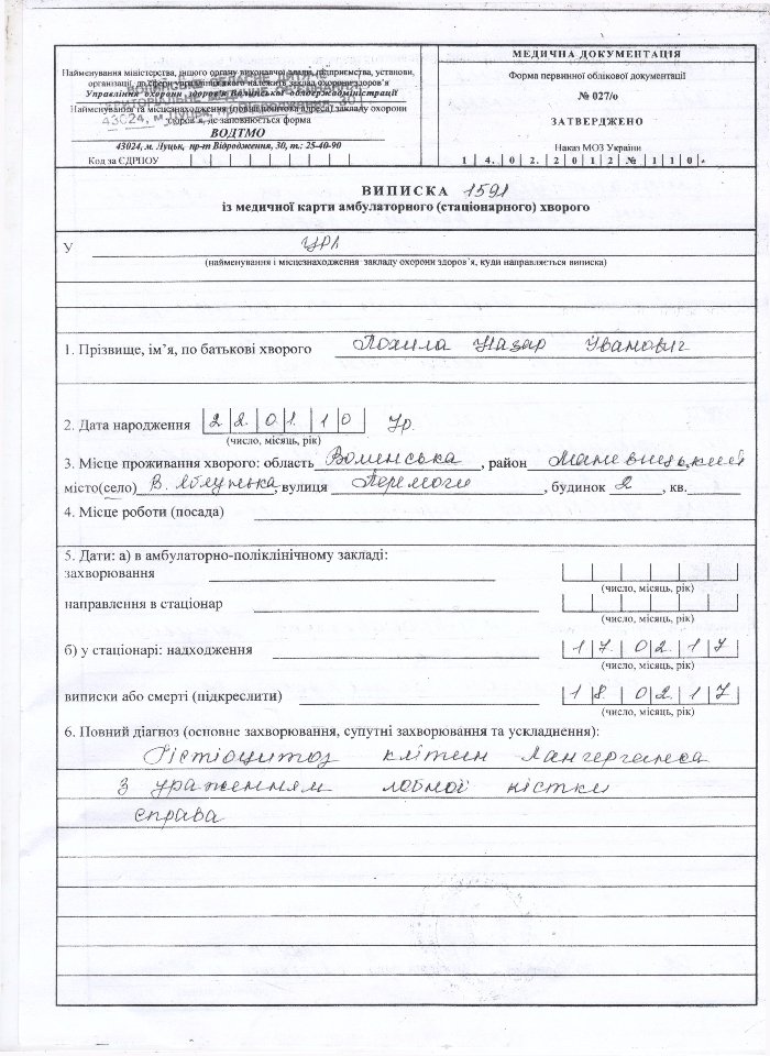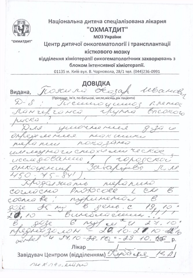 Діагноз – «Гістіоцитоз клітин Лангерганса з ураженням лобної кістки справа». Зараз дитина разом з батьками знаходиться у Польщі, в Centrum Zdrowia Dziecka, al.Dzieci Polskich 20 , Warszawa (4 поверх, хірургія, Похила Назар).