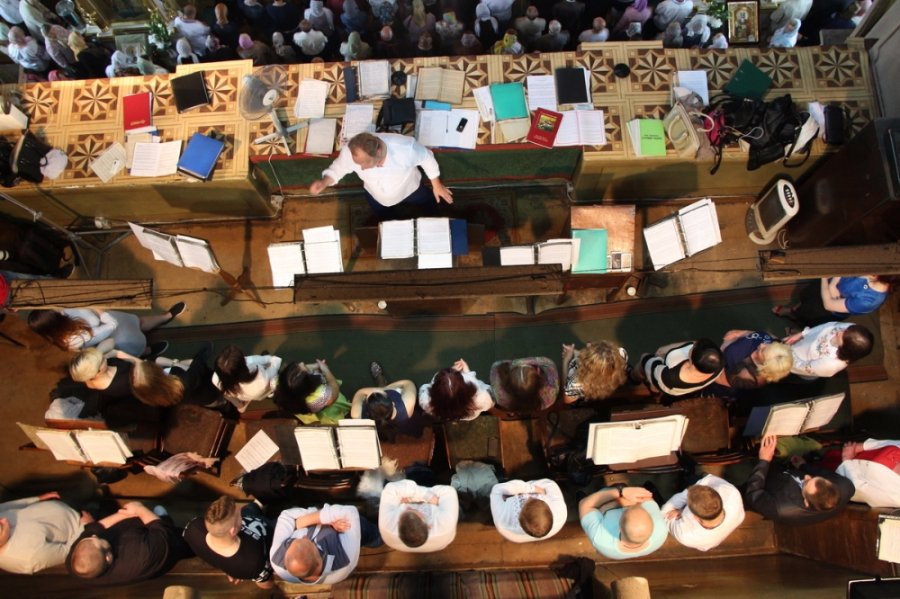 За Відправою з Його Святістю служили: митрополит Черкаський і Чигиринський Йоан, митрополит Луцький і Волинський Михаїл, архієпископ Дрогобицький і Самбірський Яків, єпископ Володимир-Волинський і Турійський Матфей, єпископ Кропивницький і Голованівський Марк, єпископ Ужгородський і Закарпатський Варсонофій, канцлер протоієрей Микола Цап, ректор Волинської православної богословської академії (ВПБА) протоієрей Володимир Вакін, декан собору протоієрей Микола Нецькар, інші декани, священнослужителі нашої та інших єпархій. Співав архієрейський хор «Оранта» (керівник Василь Мойсіюк).