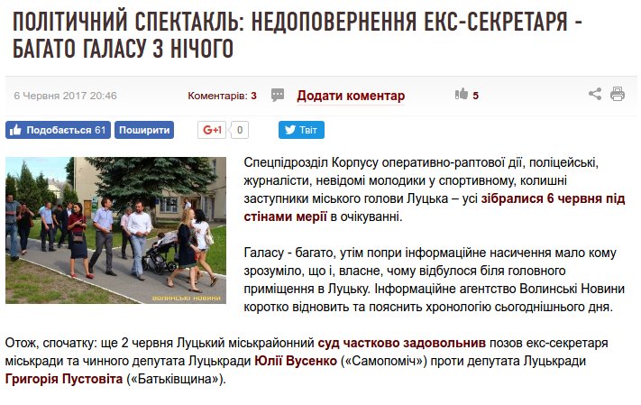 «Зрештою, очікуваного «силового штурму» з випилюванням дверей, блокуванням кабінету секретаря та відбиранням печатки Юлія Вусенко так і не спромоглась зробити. Ймовірно, саме на це і розраховували молодики у спортивному. Та після короткої прес-конференції вони ще кілька годин блукали поблизу міської ради, обговорюючи суми гонорарів, які їм вдалось заробити фактично нічого не роблячи», – додають у виданні.