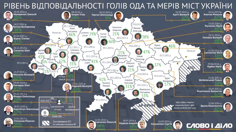 Безумовним лідером серед них є голова Київської ОДА Олександр Горган з 0% виконаних обіцянок із жовтня 2016 року. Трохи краще справи з відповідальністю у голів Житомирської та Хмельницької областей Ігоря Гундича і Олександра Корнійчука – з моменту свого призначення вони виконали 10% і 17% обіцянок відповідно.