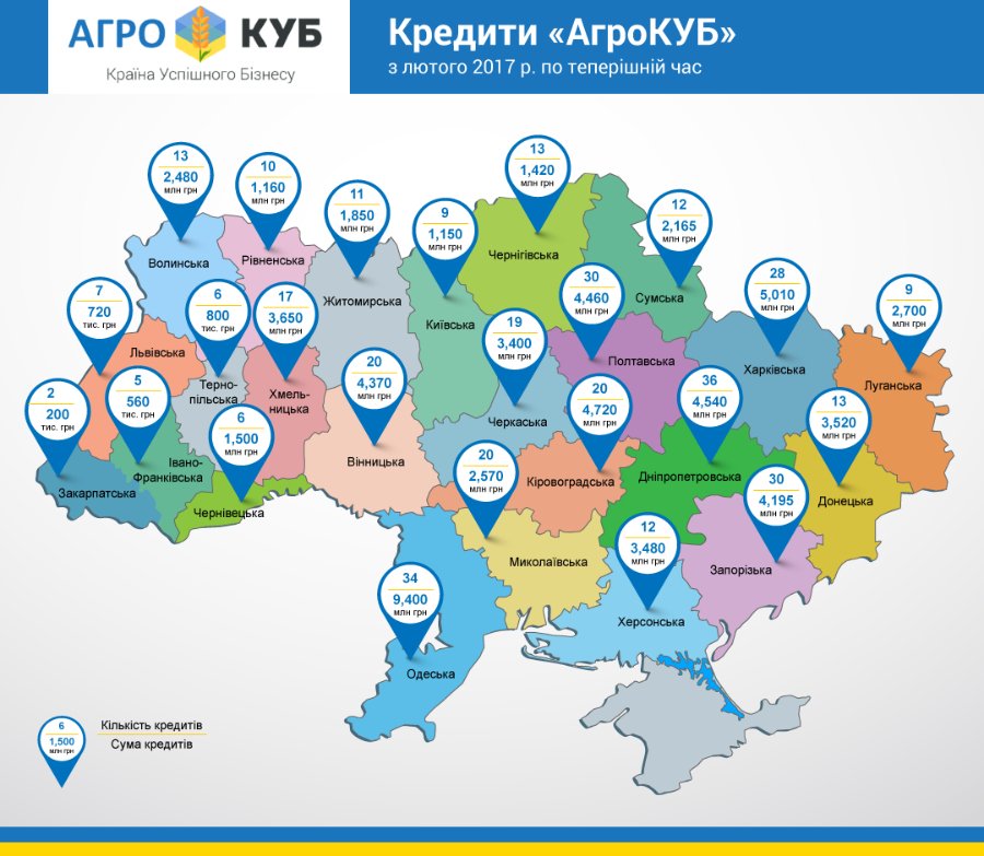 З початку лютого ПриватБанк видав підприємствам агробізнесу 390 кредитів за оновленою програмою кредитування в рамках сервісу «КУБ» («Країна успішного бізнесу»). Як повідомили в банку, загальна сума фінансування аграріїв за період лютий-травень 2017 року становить 70 060 000 грн.