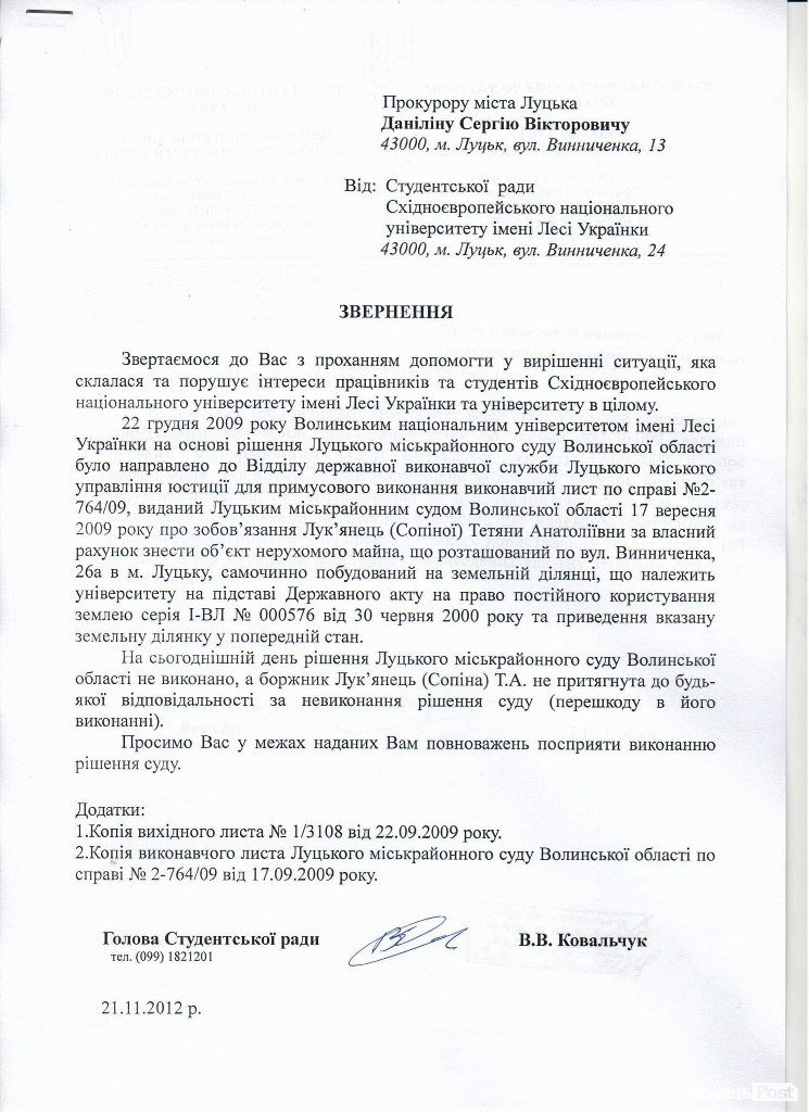 У звернені йдеться, що 22 грудня 2009 року Волинський національний університет імені Лесі Українки, спираючись на рішення Луцького міськрайонного суду, направив до Відділу державної виконавчої служби Луцького міського управління юстиції лист.
