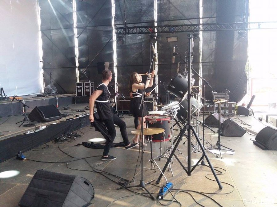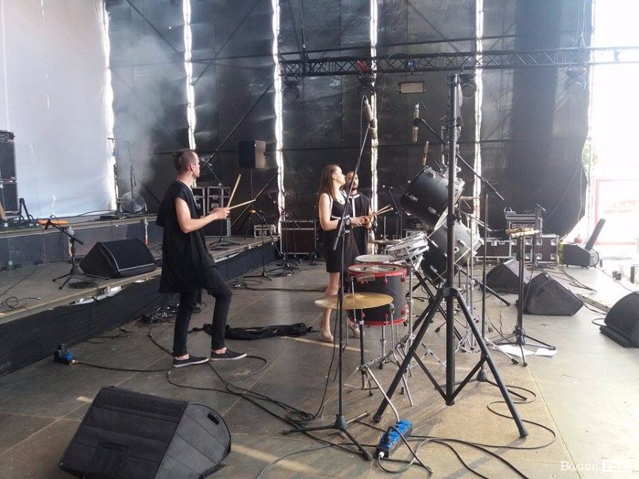 Перевірка звуку на сцені концерту. Біля інструментів - гурт "Фіолет"
